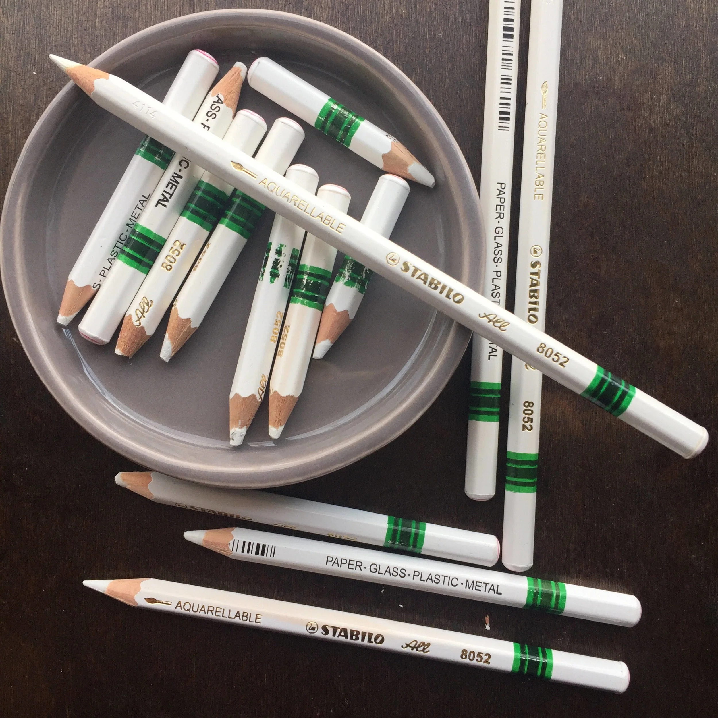 This pencil is the ultimate tool in our lettering studio, it is water soluble and has the ability to write on glass, mirror, wood, chalkboard, metals and almost anything....